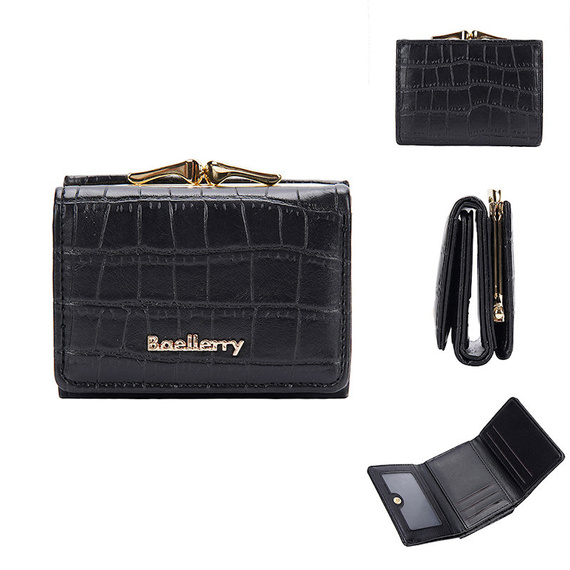 - Kobiecy zgrabny portfel w kolorze czarnym i zapięciem typu bigiel. Producent Baellerry.