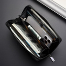 Czarny portfel damski z ekoskóry, z zamkiem i paskiem na rękę